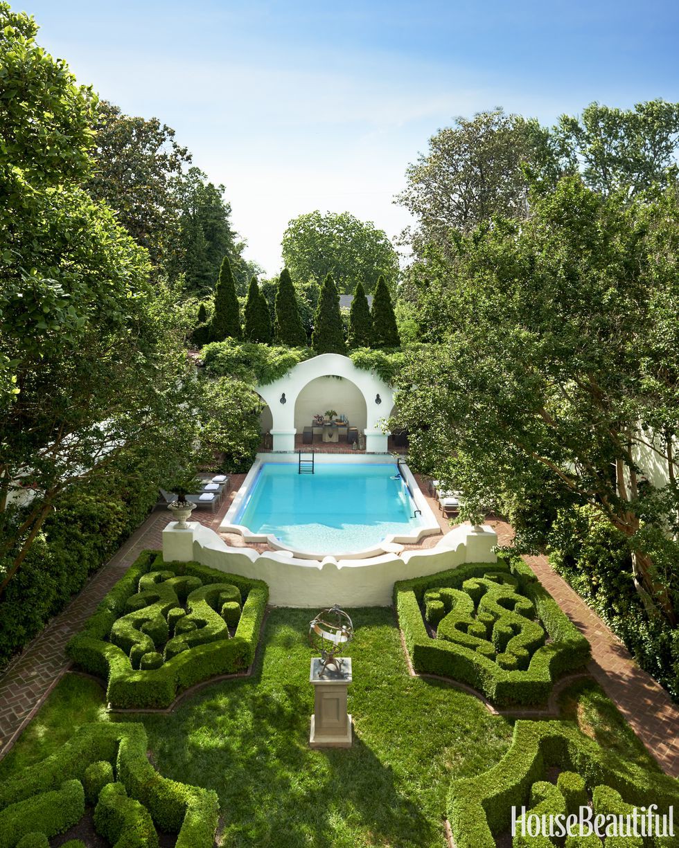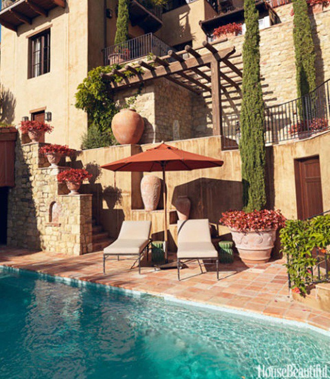 Thiết kế hồ bơi kiểu Tuscan với những ô màu cam và cây bách, sau đó mang thêm một ly rượu vang đỏ đến hồ bơi, bạn sẽ có thời gian nghỉ ngơi hoàn hảo.