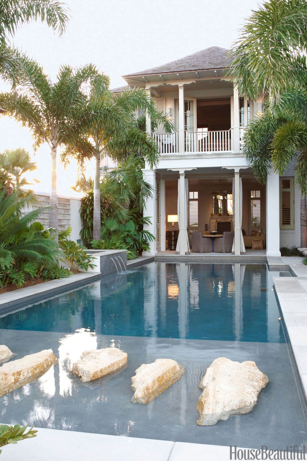 Đèn lồng bằng khí đốt treo trên hiên tạo thêm cảm xúc cho hồ bơi. Không gian này gợi mở về vùng biển Ca-ri-bê vô cùng ấn tượng.