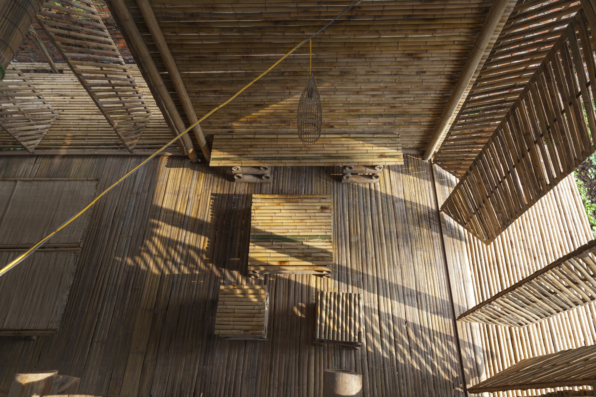 Trong công trình mẫu, toàn bộ nội thất trong nhà đều bằng tre, phần mái bằng lá dừa. Thiết kế nhà tre này có thể sử dụng linh hoạt là nhà ở, trạm y tế, cộng đồng... tùy theo tình hình. Bên trong nhà ngoài không gian sinh hoạt chung ở tầng một, còn có thêm tầng lửng. Với tổng diện tích sử dụng khoảng 44m2, ngôi nhà không quá lớn nhưng đủ một hộ gia đình nhỏ sinh hoạt.