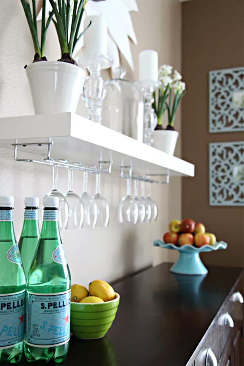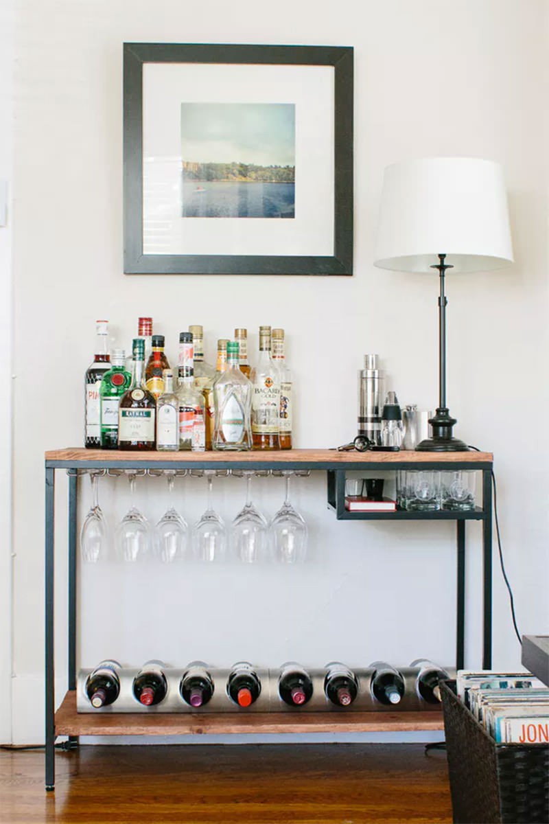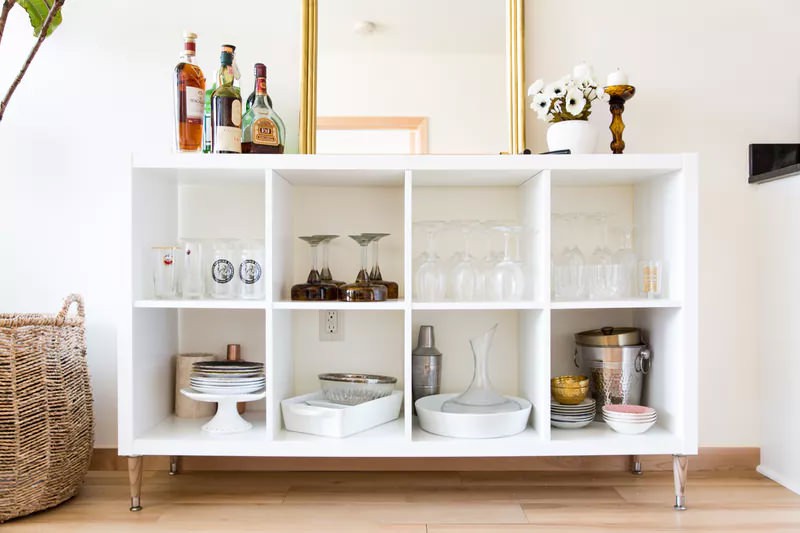 Với góc trang trí đồ uống này, bạn không cần kệ cũng như giá đỡ nhưng vẫn có góc đồ uống cực xinh nhờ đồ nội thất là tủ kê cao.