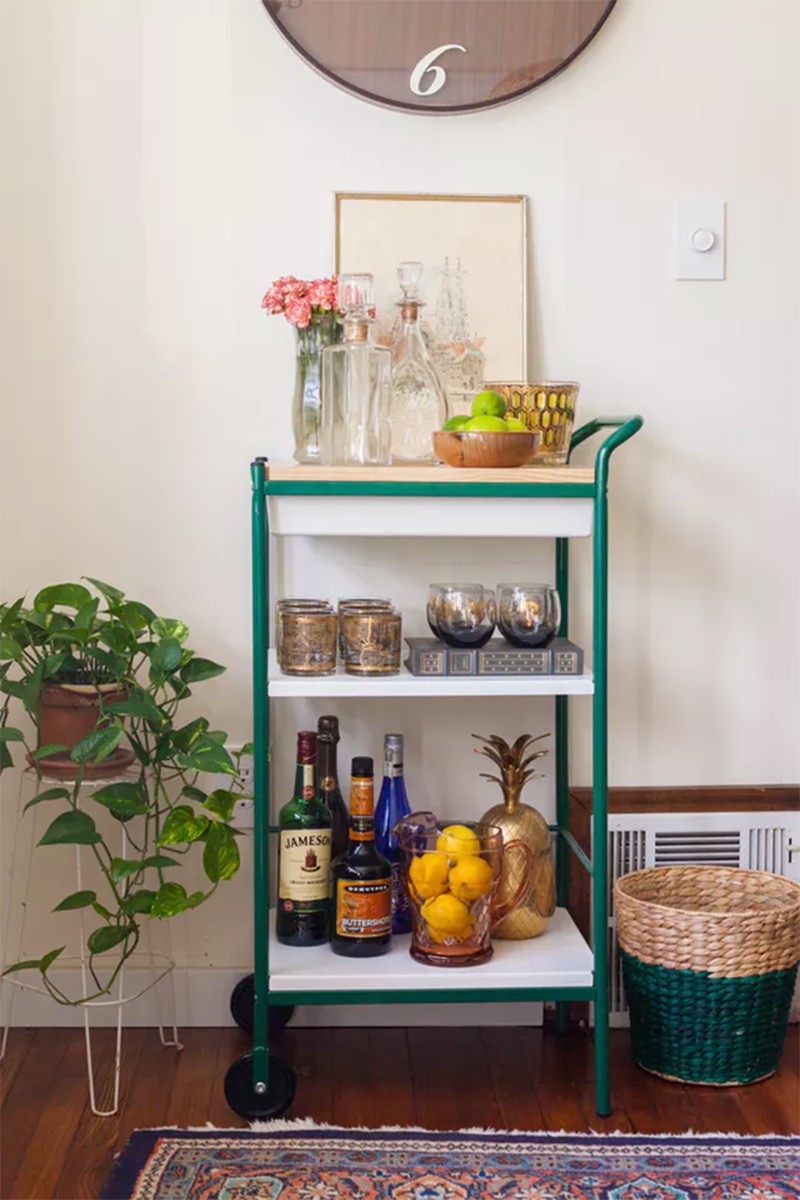 Xe đẩy nhỏ xinh để đựng đồ đồng thời có ý nghĩa trang trí đồ uống thật phong cách, rất phù hợp với những không gian nhỏ hẹp.