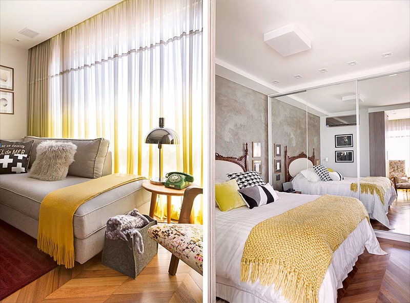 Bài trí chăn trải giường dạng dây đan màu vàng kết hợp sắc trắng của giường, ga, gối, không gian nơi đây hiện lên sáng đẹp như trong studio thực sự.