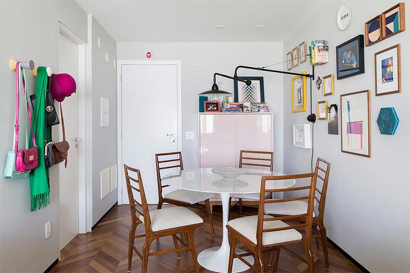 Những chiếc túi và khăn nhiều màu sắc được treo lên tường trắng tạo điểm nhấn đáng yêu cho căn phòng.